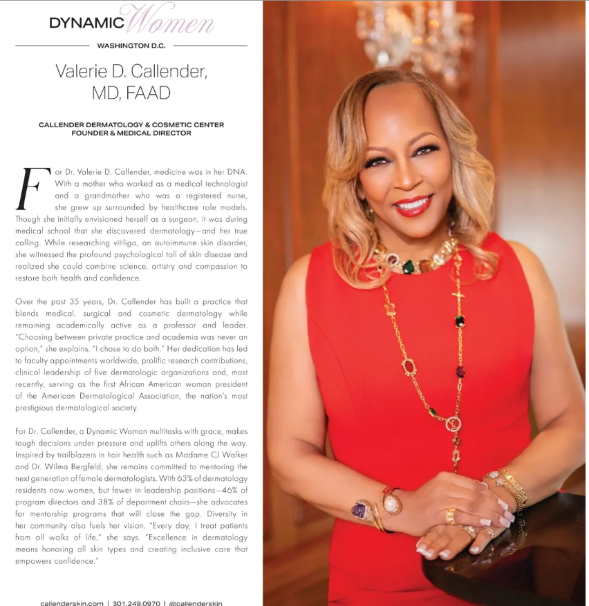 Dr. Valerie D. Callender is a Board-Certified Dermatologist who is known for her sensitive and cutting-edge approach to the management of hair loss in women and the treatment of pigmentation disorders. Dr. Callender has performed leadership roles in many dermatological organizations, including the Women’s Dermatologic Society and the Skin of Color Society, which she is Past President of both societies, and has served on the Board of Directors and Executive Committee of the American Academy of Dermatology. Dr. Callender is the current President of the American Dermatological Association the oldest Dermatologic Society in the United States. She is the Founder and Medical Director of the Callender Dermatology & Cosmetic Center and Founder and Principal Investigator for Callender Center for Clinical Research, which is in the Washington, DC metropolitan region. Dr. Callender received her medical degree from Howard University, where she also did her residency and currently serves as Professor of Dermatology at the College of Medicine. She is the recipient of the Women’s Dermatologic President’s Award and Mentor of the Year Award, and the Dermatology Foundation’s Clark W. Finnerud Award. The Clark W. Finnerud Award is given each year to an individual who has devoted extraordinary time and talent as a part-time teacher and clinician.